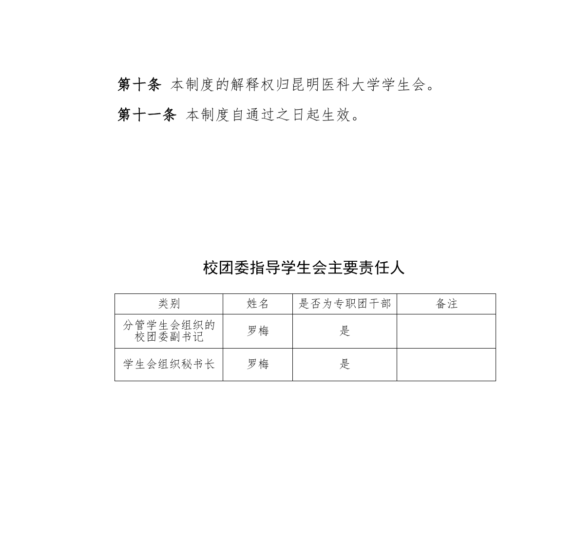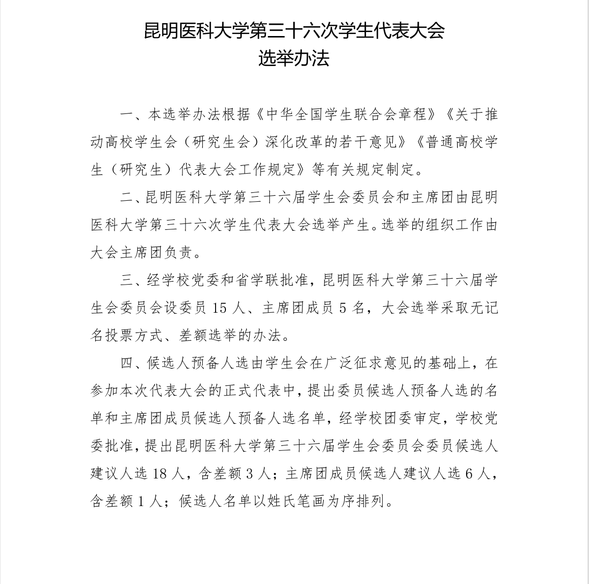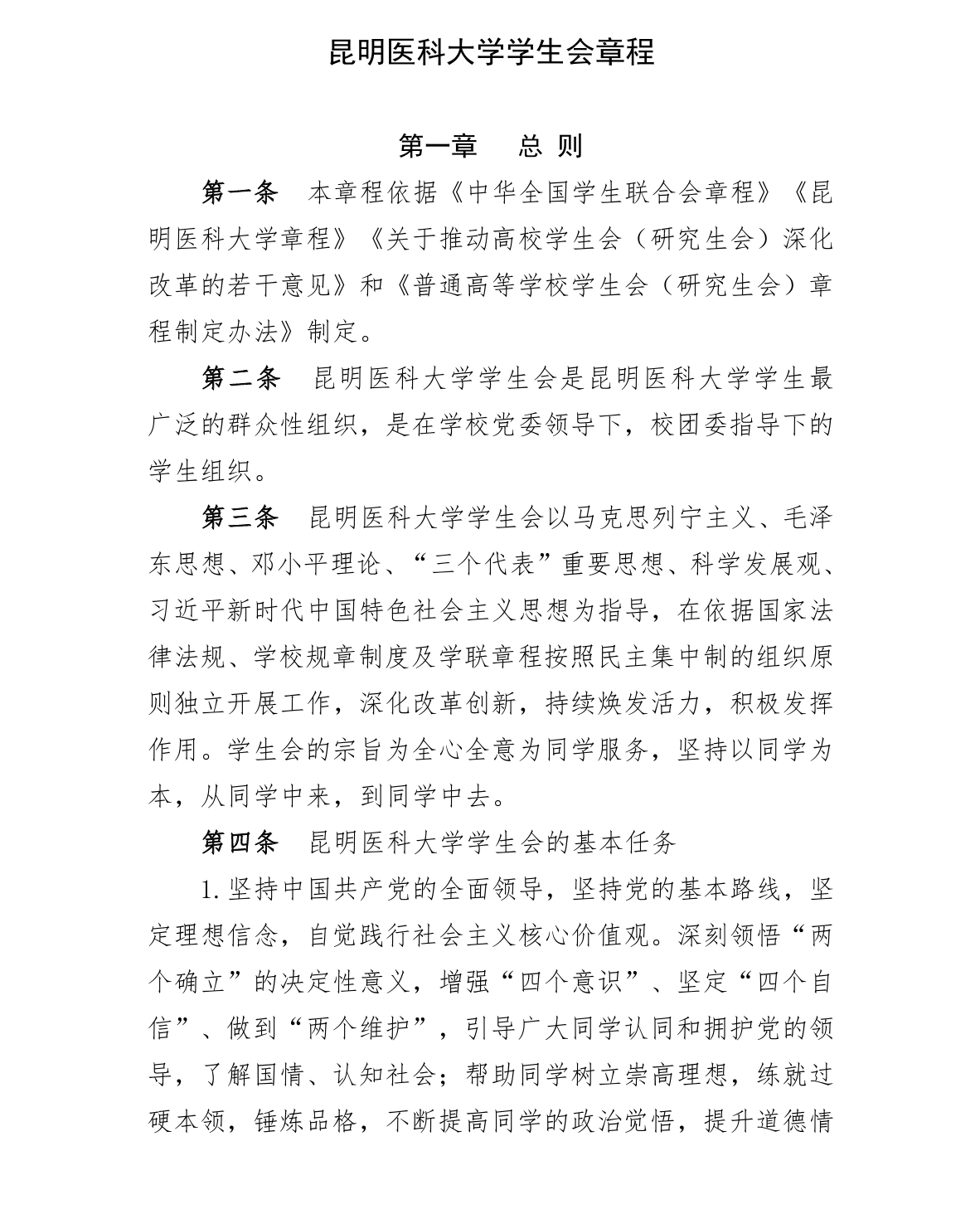 根据共青团中央办公厅、全国学联秘书处《普通高等学校学生会章程制定办法》《普通高等学校学生(研究生)代表大会工作规定》以及共青团中央、教育部、全国学联联合下发的《关于推动高校学生会深化改革的若干意见》的内容和要求,作了进一步修订,形成《昆明医科大学学生会章程》。