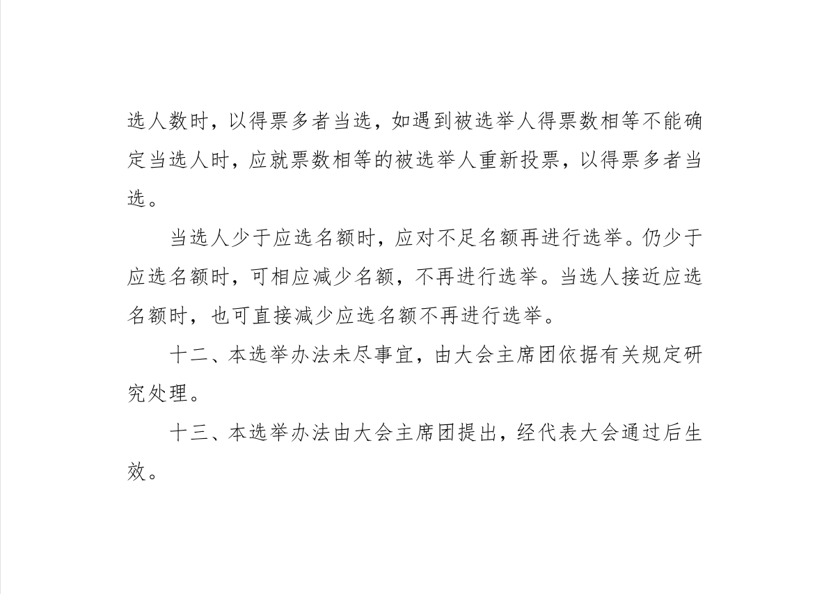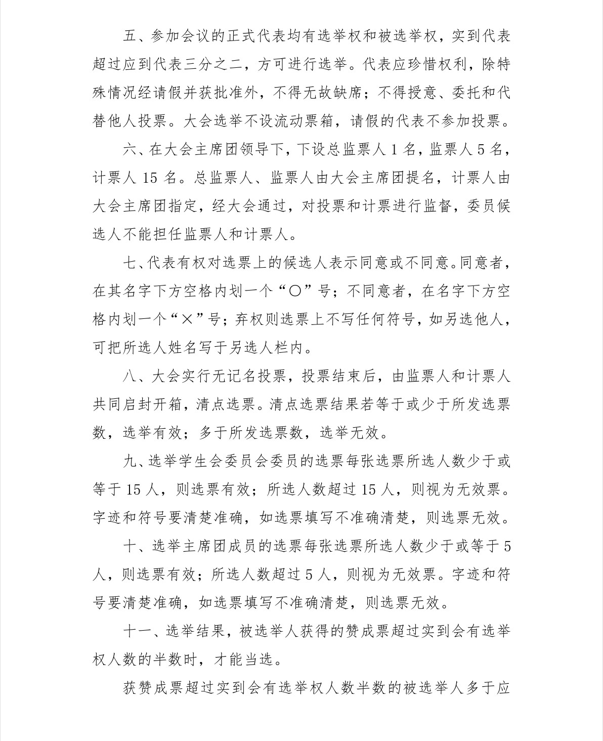 代表名额按照大会代表名额不低于全日制在校本、专科生人数的1%的规定,并根据各选举单位学生人数,进行分配。推选代表的工作在各级党组织领导下,依据代表名额的分配,召开学生大会或学生代表会议选举产生。代表候选人预备人选名单,需要在各单位团委指导下,征求同级党组织意见,并在所在单位学生中充分酝酿后提出。最后,在酝酿协商的基础上,代表候选人采用无记名投票和差额选举(不少20%)的办法选举产生,并在一定范围内公示无异议。