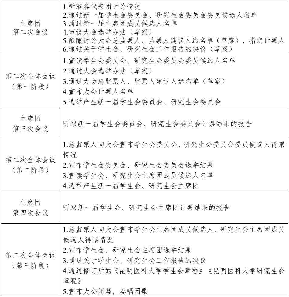 昆明医科大学学生会、研究生会主席团成员候选人由各学院团组织推荐,经学院党组织同意,由学校团委和学校学生工作部门联合审查后,报学校党委确定。主席团候选人要具有代表性,从校院学生会工作人员和各领域优秀学生典型中产生。昆明医科大学第三十六届学生会主席团成员、第九届研究生会主席团成员在昆明医科大学第三十六次学生代表大会、第九次研究生代表大会选举产生。