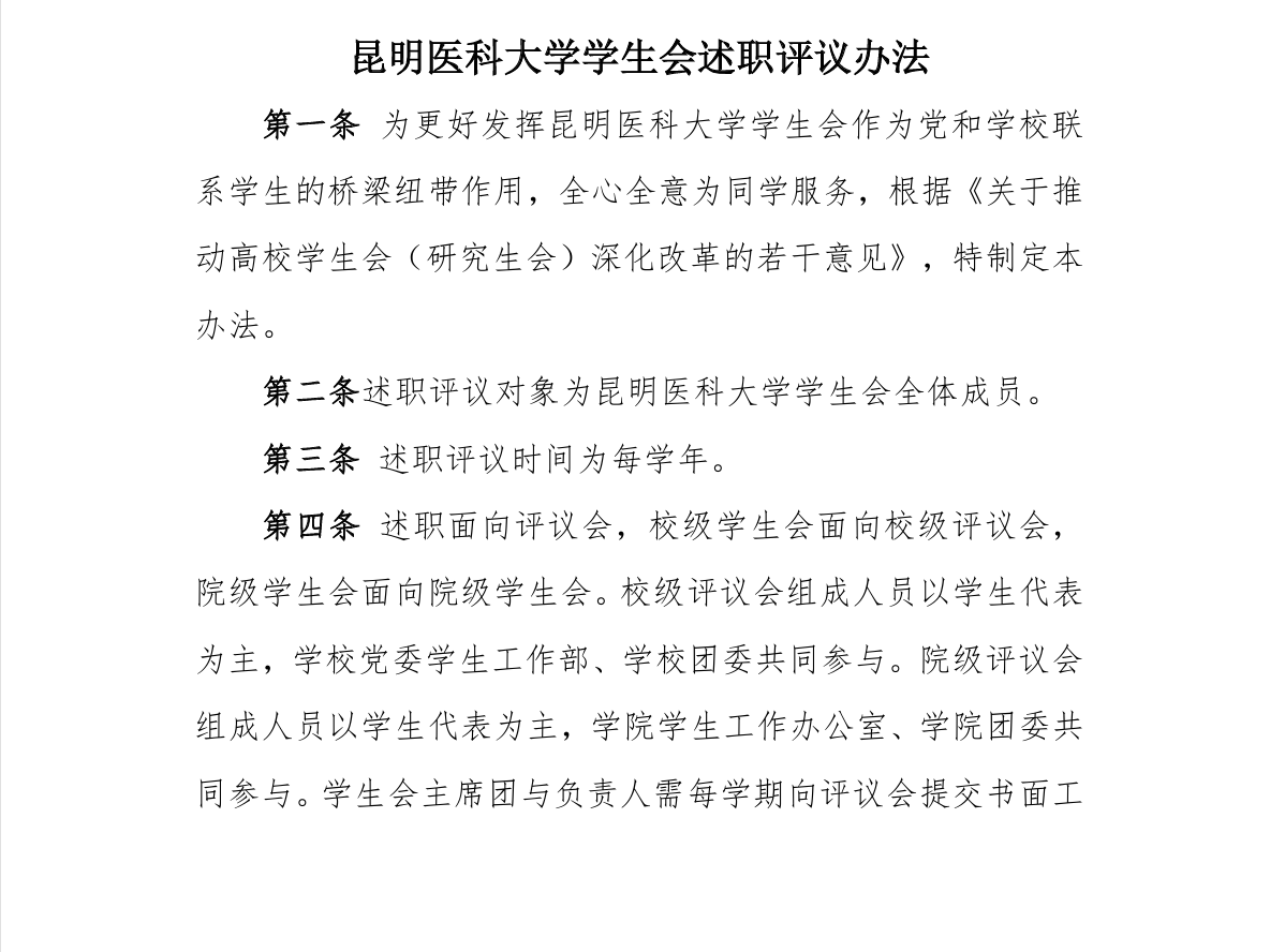 为进一步深化学生会(研究生会)改革,落实学校团委对学生会组织指导管理工作责任,规范述职评议工作,根据《学联学生会组织改革方案》《关于推动高校学生会(研究生会)深化改革的若干意见》《昆明医科大学学生会组织改革实施方案》等文件精神,结合我校学生会组织工作实际,制定本办法。