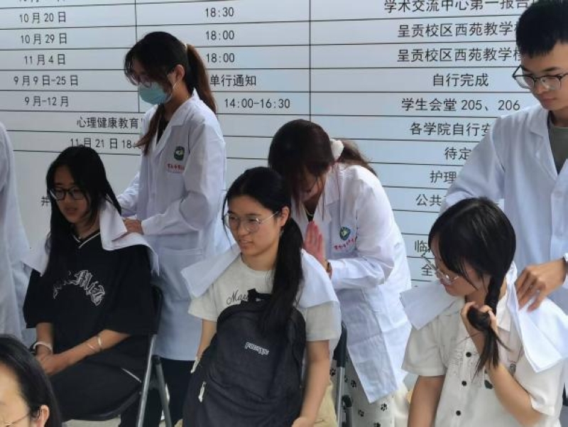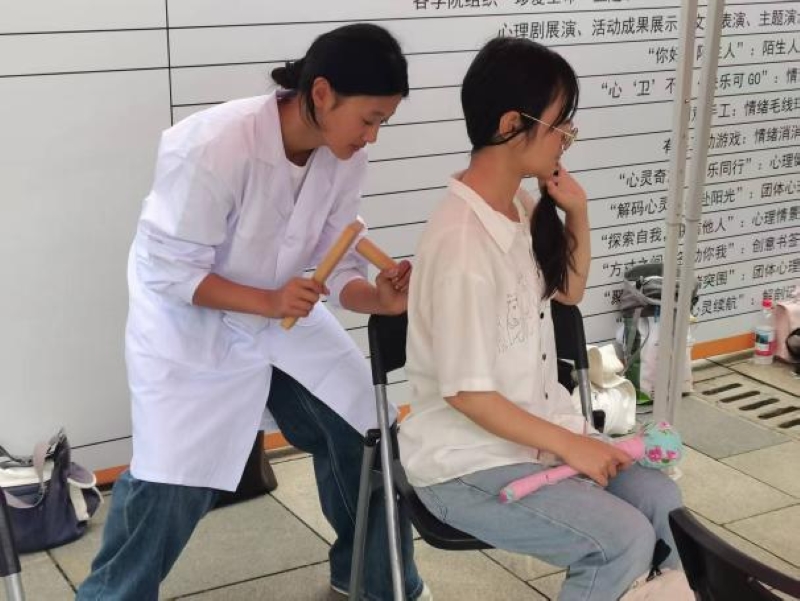 此外,云南中医药大学民族医药学院摩雅志愿服务队带来中医特色疗法体验更是吸引了广大师生的目光,收获了体验者的一致好评。捶筋疗法疏通经络,缓解了师生们忙碌的工作学习带来的疲劳酸痛;耳穴贴压通过王不留行籽贴压相应耳穴调节脏腑功能,缓解失眠、疼痛、消化不良等;还有少数民族特色药线点灸,展示了民族医药特色,温通经络;艾灸疗法及推拿按摩体验同样带来了温经散寒、扶阳固脱、舒筋活络、解痉止痛等疗效。丰富多样的中医疗法体验让师生们近距离感受到了中医的独特魅力,进一步促进了中医文化的传播。