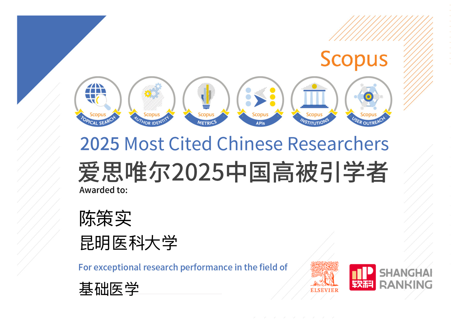 近期,爱思唯尔(Elsevier)正式发布2025年度“中国高被引学者”(Highly Cited Chinese Researchers)榜单。昆明医科大学生物医学工程研究院院长、云南省肿瘤医院副院长、云南省乳腺癌精准医学重点实验室主任陈策实研究员入选“基础医学”学科榜单。