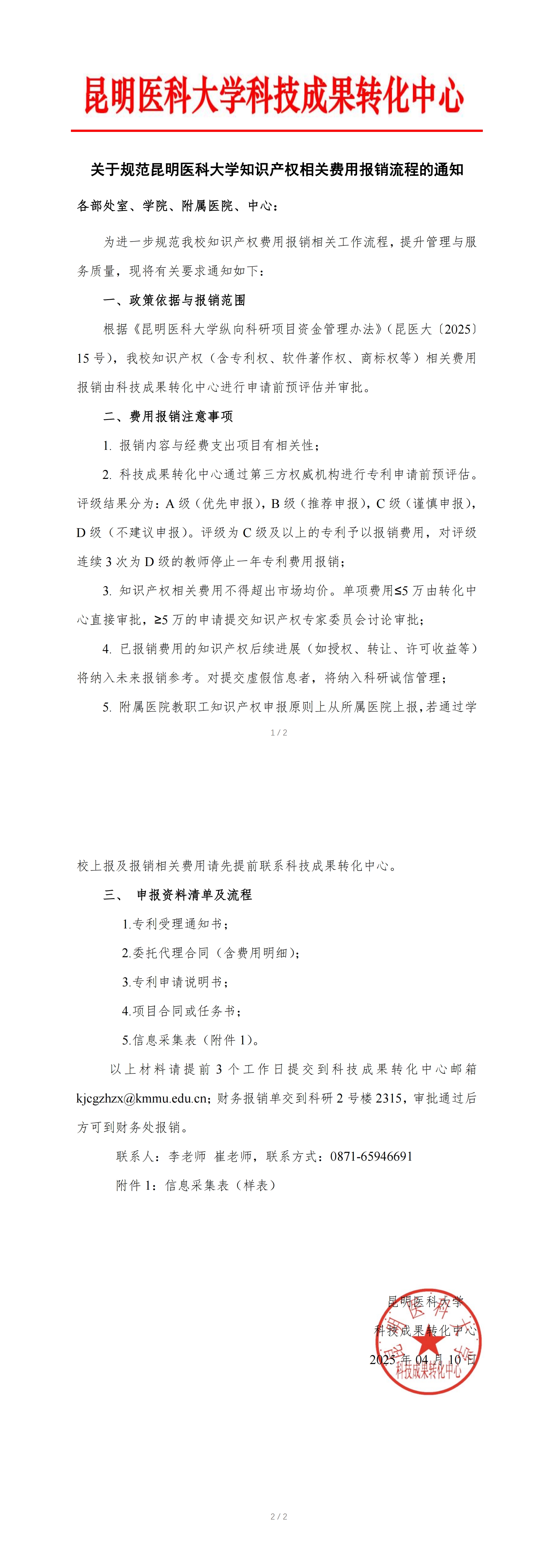 关于规范昆明医科大学知识产权相关费用报销流程的通知