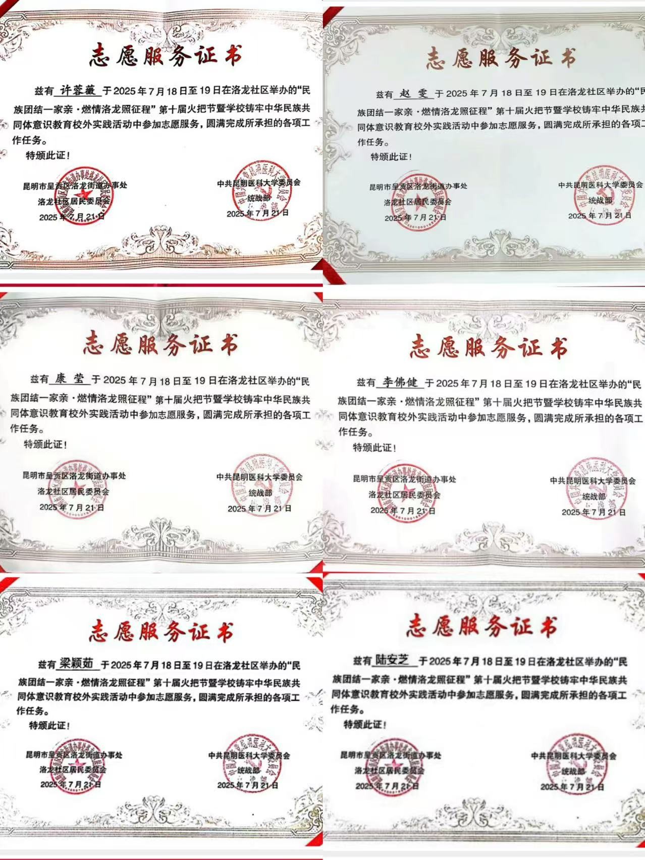 2025年7月18日,昆明市呈贡区洛龙街道第十届火把节盛大启幕,药学院6名同学挺膺担当参加了志愿服务,为这场充满民族风情的活动贡献青春力量。