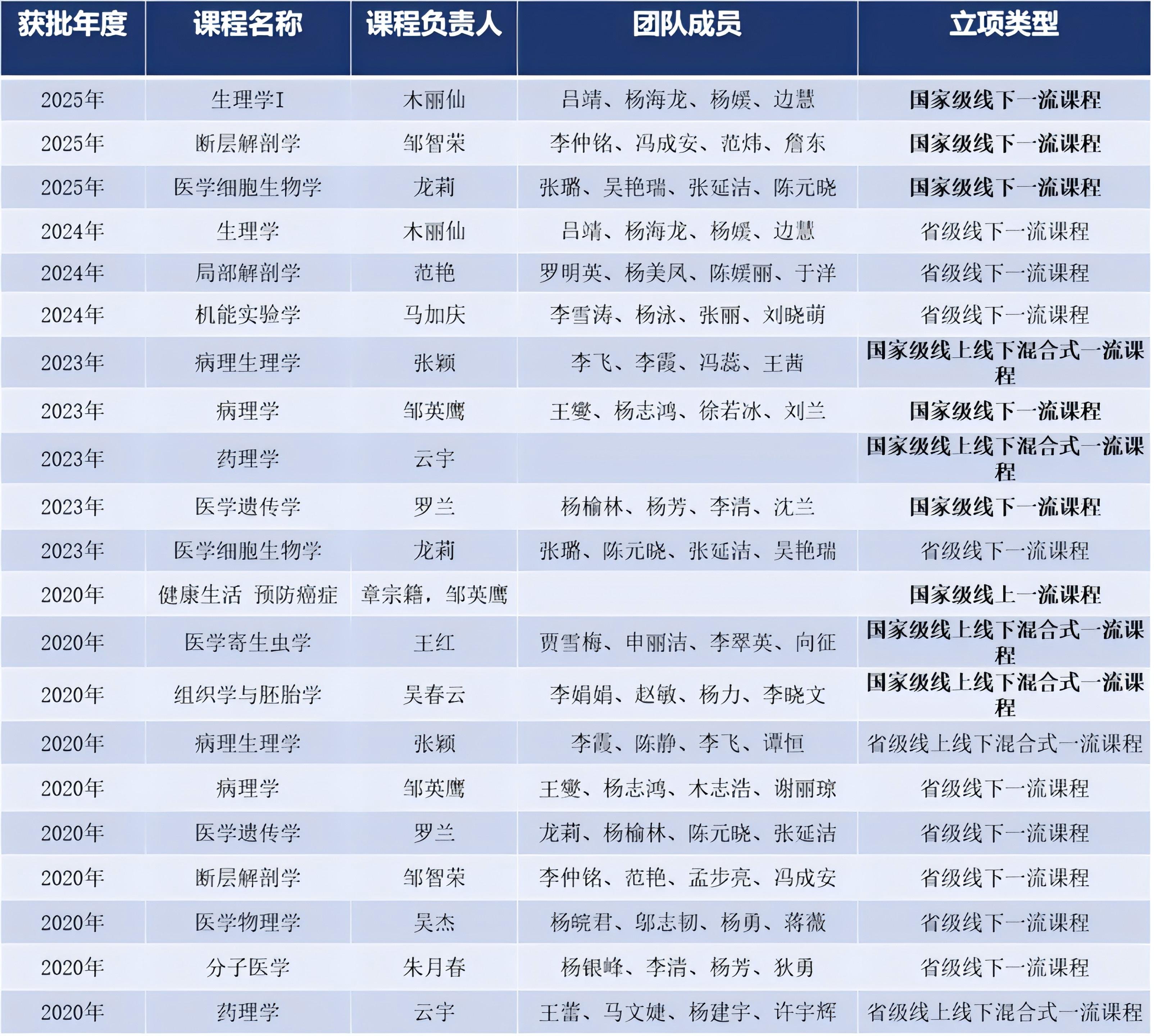 近日,教育部发布《关于公布第三批国家级一流本科课程认定结果的通知》(教高函〔2025〕9号),昆明医科大学基础医学院三门课程--《生理学I》、《断层解剖学》与《医学细胞生物学》成功获评为“国家级线下一流本科课程”。本次入选的三门课程均为学院长期建设的专业核心课程,此次获批,是学院持续深化教学改革、深耕课程内涵建设取得的又一重大成果。至此,我院累计获批的国家级一流本科课程数量已达到10门,另拥有省级一流本科课程11门。这一成果标志着学院在构建高质量本科课程体系、提升人才培养根基方面取得了扎实而显著的成效。