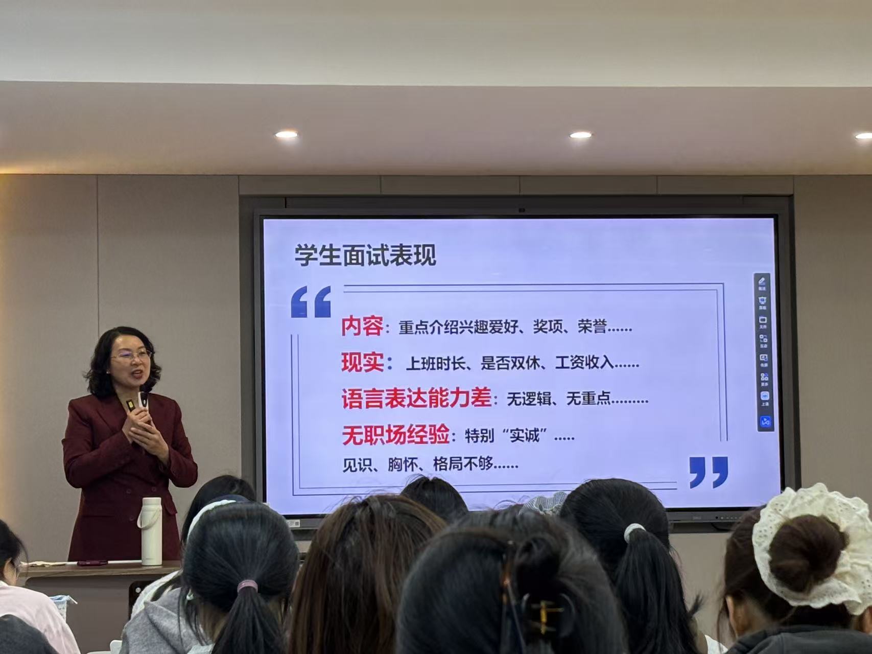 讲座伊始,张保兰院长以“求职面试中的核心竞争力与价值呈现”为主题开篇,直击当前毕业生求职面试中的普遍痛点,精准剖析了面试中存在的“内容偏离岗位需求”“语言表达逻辑混乱”“职场经验不足”“格局视野欠缺”等共性问题,为毕业生精准定位自身短板、明确提升方向提供了清晰指引。