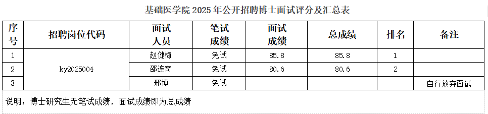 按照昆明医科大学2025年公开招聘人员面试考核工作的相关要求,我院于2025年11月4日对公开招聘博士工作人员进入面试人员进行了面试考察,本着公平、公正、择优录用的原则,进行了试讲以及综合素质面试,现将基础医学院2025年公开招聘博士工作人员面试考核结果予以公示。