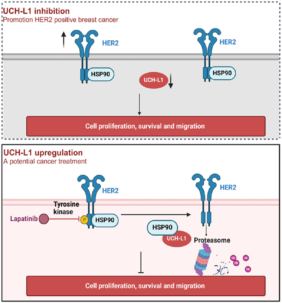 该研究发现,接受TCbHP标准治疗方案的HER2型乳腺癌患者中,UCH-L1低表达乳腺癌患者的病理完全缓解率显著高于UCH-L1阴性患者(71.4% vs 28.5%)。在细胞水平上的研究发现,UCH-L1在HER2阳性乳腺癌细胞系中存在高甲基化修饰从而缺失表达,进一步通过分析临床样本结果表明,UCH-L1与HER2表达呈现明显的负相关关系。机制研究表明,UCH-L1通过与HER2的伴侣蛋白HSP90结合,可以不依赖酶活抑制HSP90与HER2的相互作用,下调HER2蛋白表达,进而抑制HER2阳性乳腺癌细胞活力。上调UCH-L1表达可以显著增加HER2阳性乳腺癌拉帕替尼治疗的敏感性,为HER2阳性乳腺癌治疗提供了新策略。