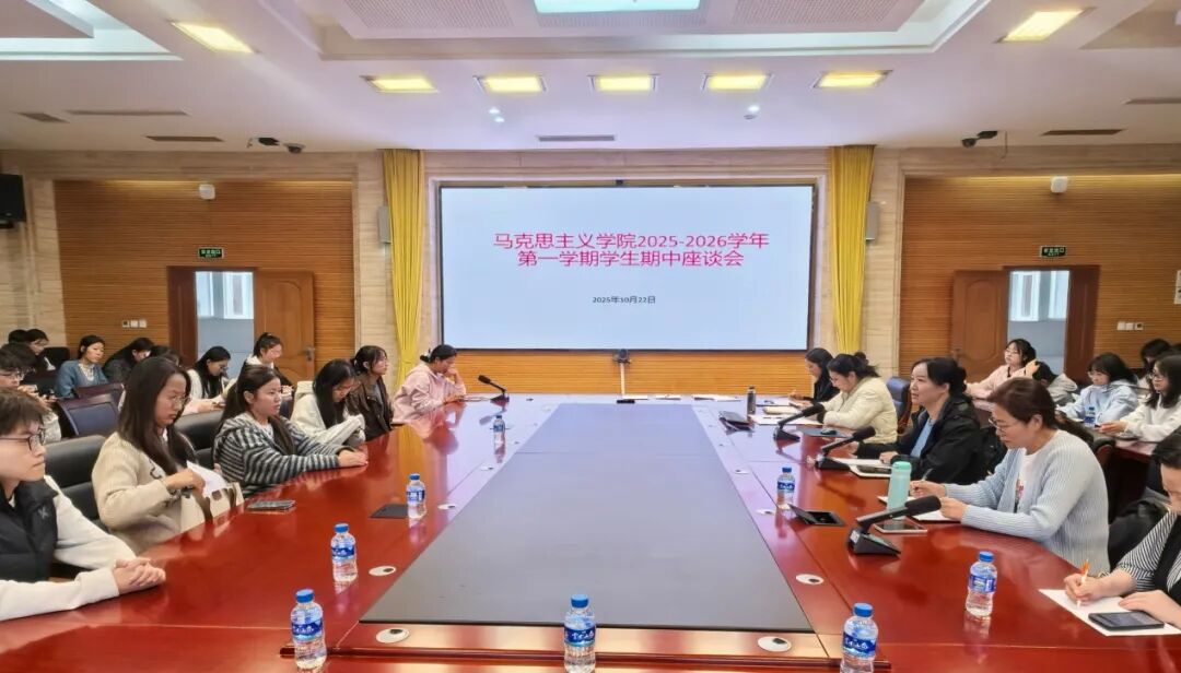 2025年10月22日下午,马克思主义学院在学术交流中心302会议室召开本科生期中座谈会。座谈会由学院副院长王砚蒙主持,学院教学办、教学督导、各教研室主任以及2024级、2025级学生代表参加了会议。