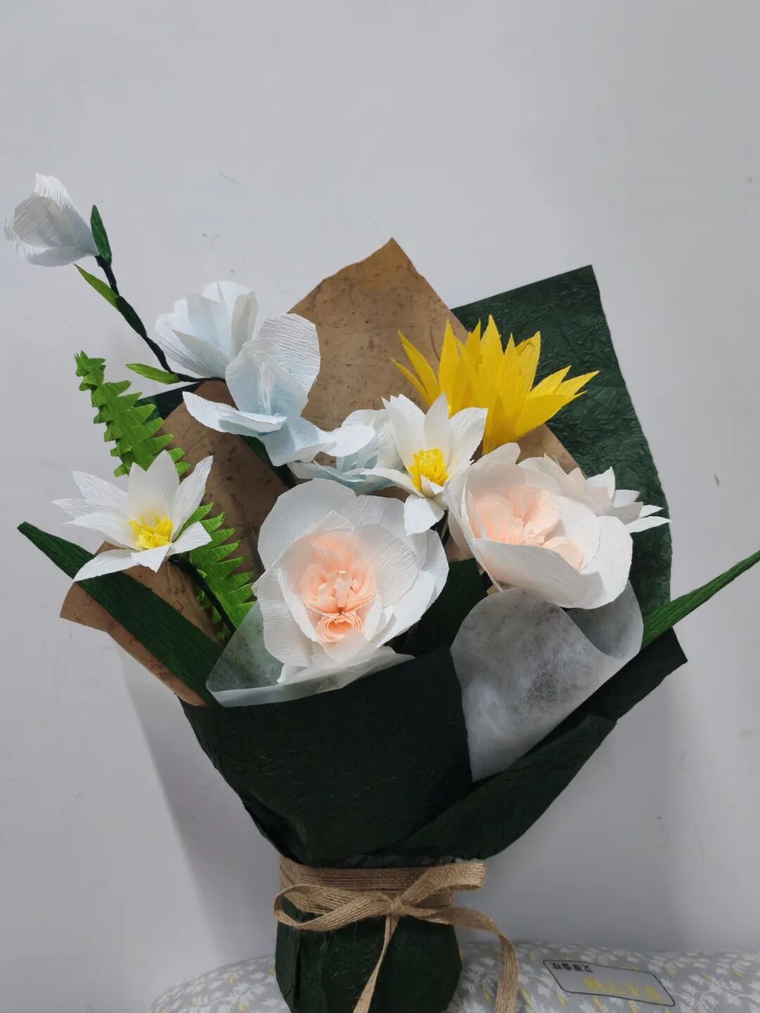 三等奖作品“战地之花”由雷玉、于昕共同完成,以褶皱纸手工制作剑兰、天使玫瑰及小雏菊,呼应抗战胜利80周年主题,以柔韧材料展现战火中生命的顽强与温柔。雷玉说:“这束花表达了对先烈的缅怀与致敬,提醒我们铭记历史、不忘初心。”于昕则表示:“我试图以柔纸展现坚韧,于层层褶皱中传递战火也无法湮没的温柔与生机。获得三等奖是对这份心意的小小鼓励。”