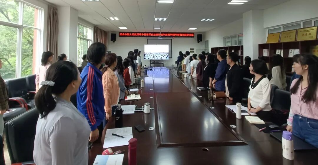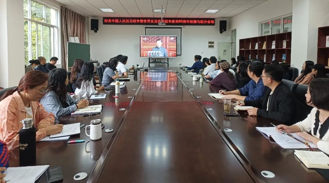 2025年9月3日上午,马克思主义学院领导班子成员、全院无课教师、25级研究生新生共计50余名师生在209会议室共同收看纪念中国人民抗日战争暨世界反法西斯战争胜利80周年大会。习近平总书记的重要讲话振奋人心,天安门广场前的盛大阅兵举世瞩目,人民解放军的坚定步伐昭示了中华民族伟大复兴之路势不可挡。