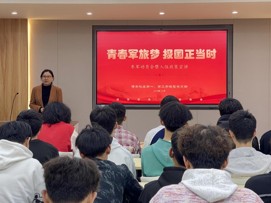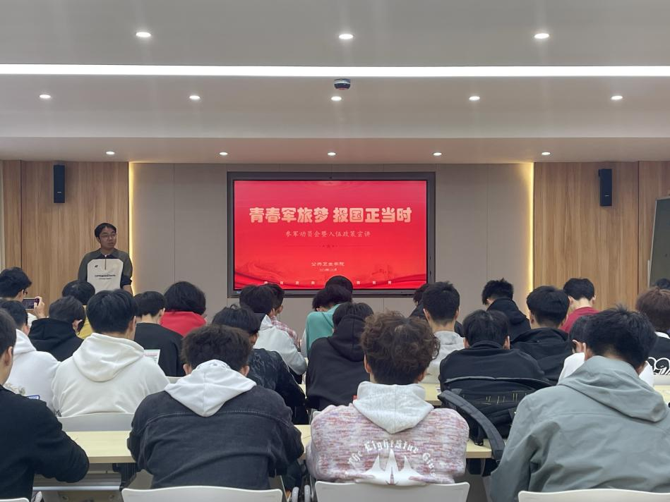 国防建设事关党和国家长治久安,事关国家主权安全,事关强国建设、民族复兴伟业。建设和发展一支“听党指挥、能打胜仗、作风优良”的人民军队是新形势下加强和巩固国防建设的必然要求,也是党和国家面对复杂多变国内国际发展大势的重要支撑。为进一步激励广大同学积极携笔从戎、报效国家,全方位增强同学们对于军旅生活的认识及对参军入伍政策的理解与把握。2024年10月23日18:00,公共卫生学院联合博学园“一站式”学生社区第一、第二功能型党支部在昆明医科大学“一站式”学生社区一二栋2楼多功能报告厅组织开展公共卫生学院2024年“青春军旅梦,报国正当时”征兵动员会暨参军入伍政策宣讲活动。