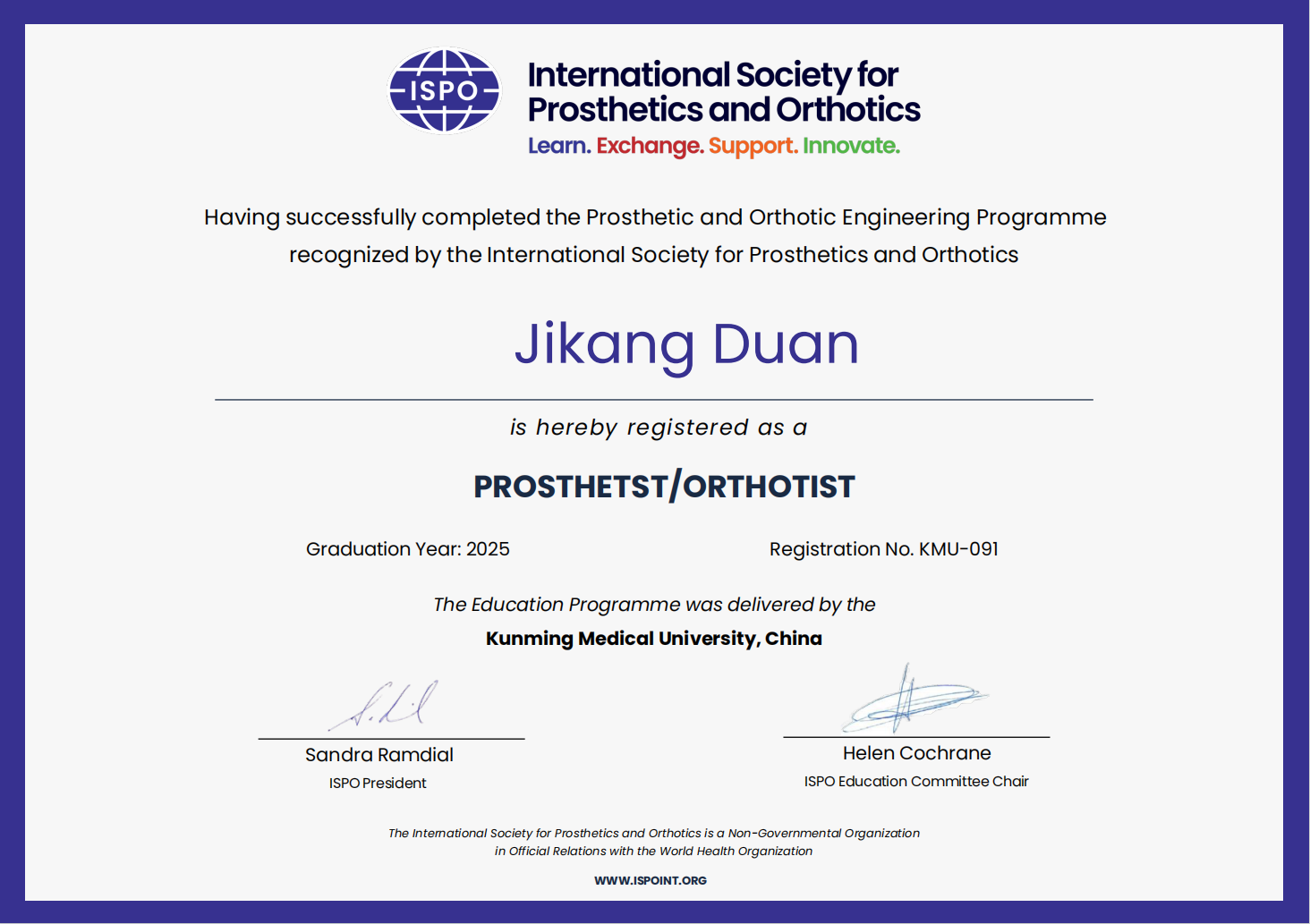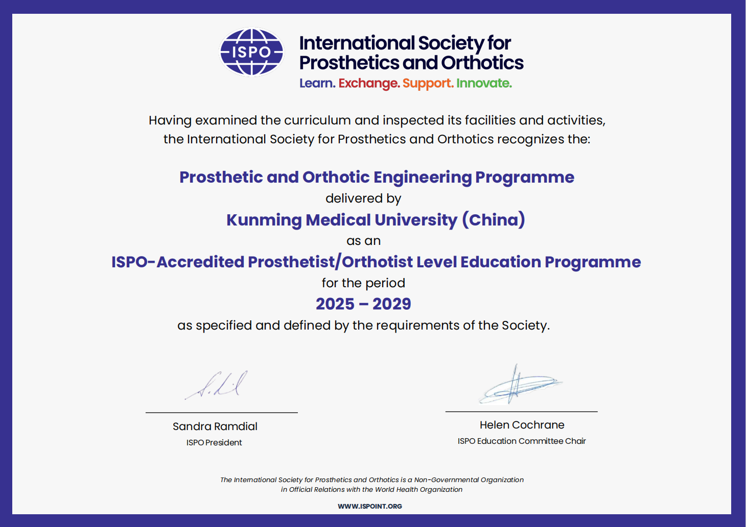 近日,昆明医科大学收到国际假肢矫形学会(International Society for Prosthetics and Orthotics,ISPO)的正式通知,学校假肢矫形工程专业通过了ISPO国际复认证。本次是该专业继2022年6月通过ISPO国际认证(三年期)后,再次通过ISPO国际认证,认证期为2025—2029年(四年期)。
