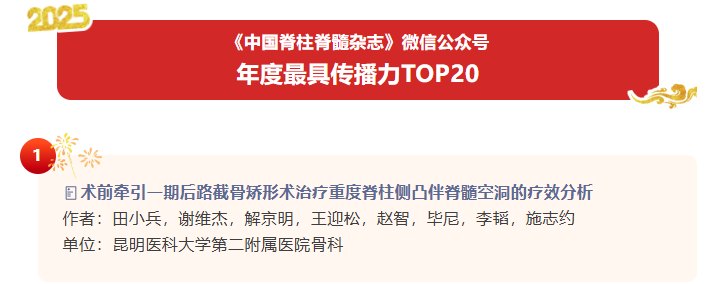 《中国脊柱脊髓杂志》是国内脊柱脊髓领域核心权威期刊,其公众号年度榜单以文章传播力、学术价值、临床指导意义为评选依据,入选的TOP20文章均为年度内行业关注度高、兼具学术深度与临床实用价值的优秀成果。