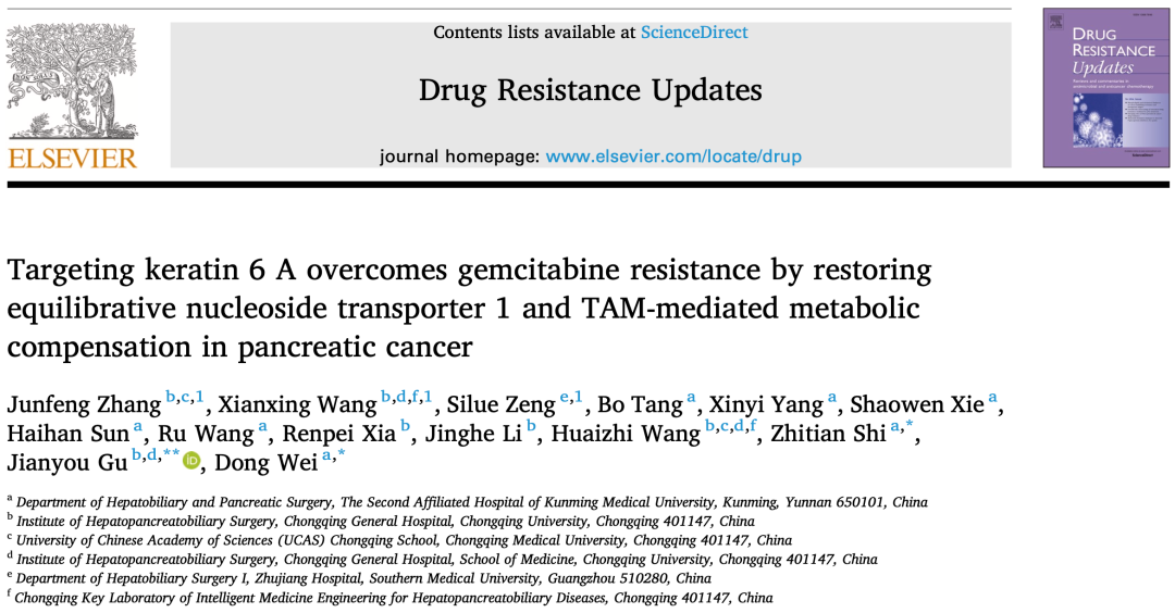 近日,昆明医科大学第二附属医院肝胆胰外科四病区魏东教授团队取得重大科研突破,成功破解胰腺癌吉西他滨化疗耐药关键机制,相关研究成果以“Targeting keratin 6A overcomes gemcitabine resistance by restoring equilibrative nucleoside transporter 1 and TAM-mediated metabolic compensation in pancreatic cancer”为题正式发表于国际顶尖期刊《Drug Resistance Updates》。该期刊为中科院一区TOP 刊物,影响因子为21.7,标志着医院肝胆胰疾病基础与转化研究实力迈入国际高水平行列,昆明医科大学第二附属医院为论文第一完成单位。