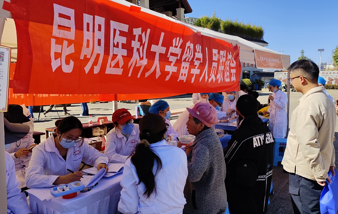 每年1月是云南省民族团结进步宣传教育活动月,今年活动月主题是“沿着习近平总书记的足迹,重温习近平总书记的回信——让民族团结进步之花在云岭大地越开越绚烂”。1月19日,昆明医科大学组织学校留学人员联谊会、直属单位党委、基础医学院、护理学院、第一附属医院、附属口腔医院共同组建医疗义诊和健康宣教服务团队,到学校铸牢中华民族共同体意识教育校外实践基地——洛龙社区,参加民族团结进步宣传教育活动月活动。