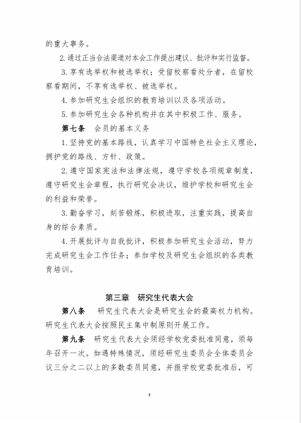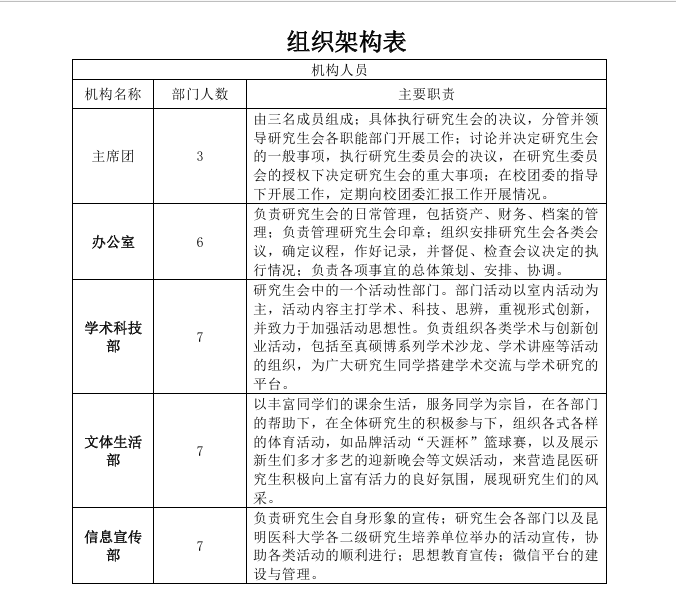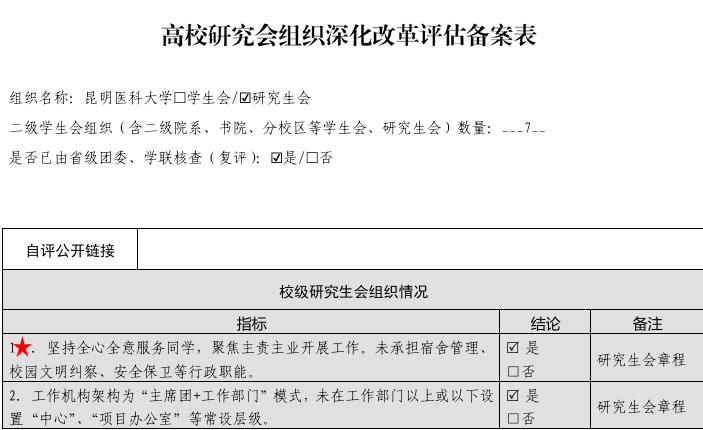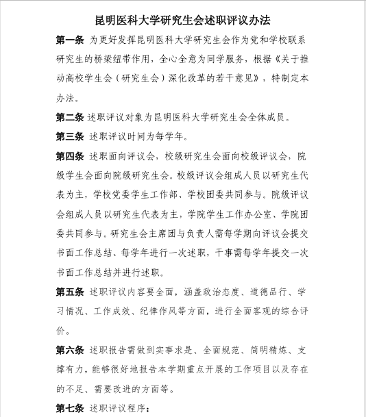 为落实共青团中央、教育部、全国学联联合下发的《中华全国学生联合会章程》以及《昆明医科大学章程》,并结合《关于推动高校学生会(研究生会)深化改革的若干意见》和《普通高等学校学生会(研究生会)章程制定办法》等文件要求,接受广大师生监督,现将我校2024-2025学年研究生会改革情况公开如下: