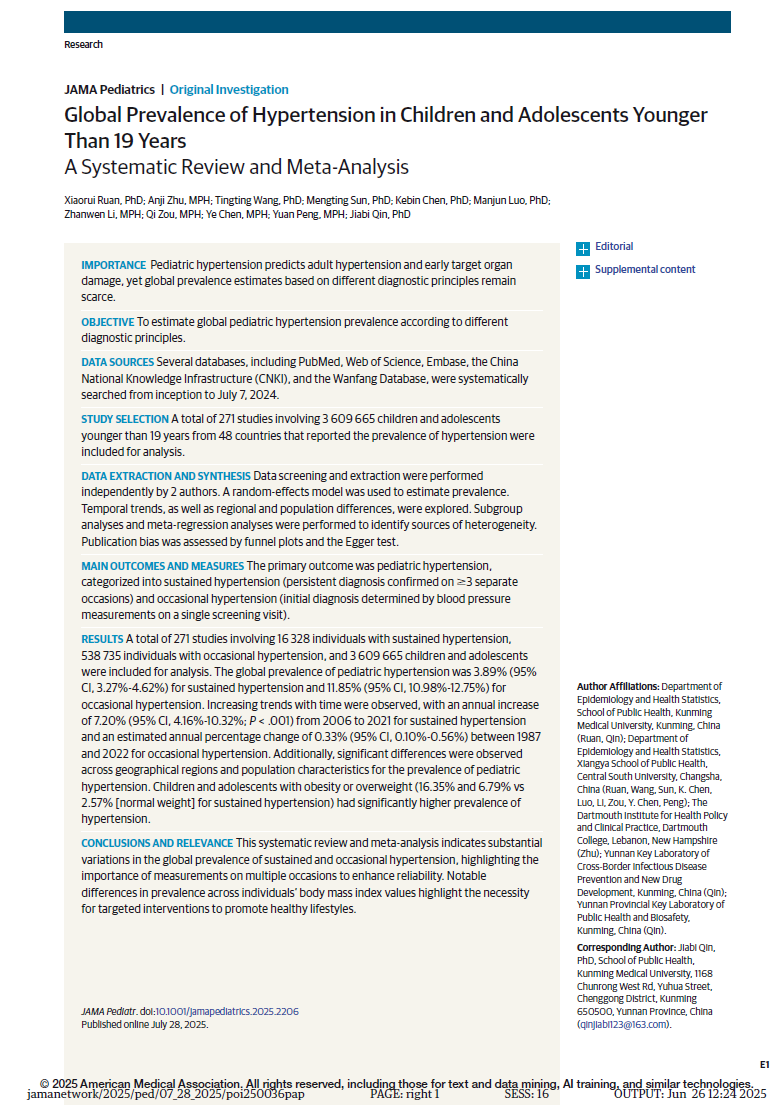 近日,昆明医科大学公共卫生学院秦家碧教授团队在儿科领域顶刊《JAMA Pediatrics》(中国科学院1区Top,IF=24.7,儿科领域排第1)上发表题为《Global Prevalence of Hypertension in Children and Adolescents Younger Than 19 Years》的科研论文。昆明医科大学公共卫生学院秦家碧教授为该文章的唯一通讯作者,其博士生阮霄睿为文章唯一第一作者。昆明医科大学公共卫生学院为并列第一作者单位和唯一通讯作者单位。本研究受国家自然科学基金(82473644、82404362、82073653)、省杰出青年基金、省重点研发计划等项目资助。