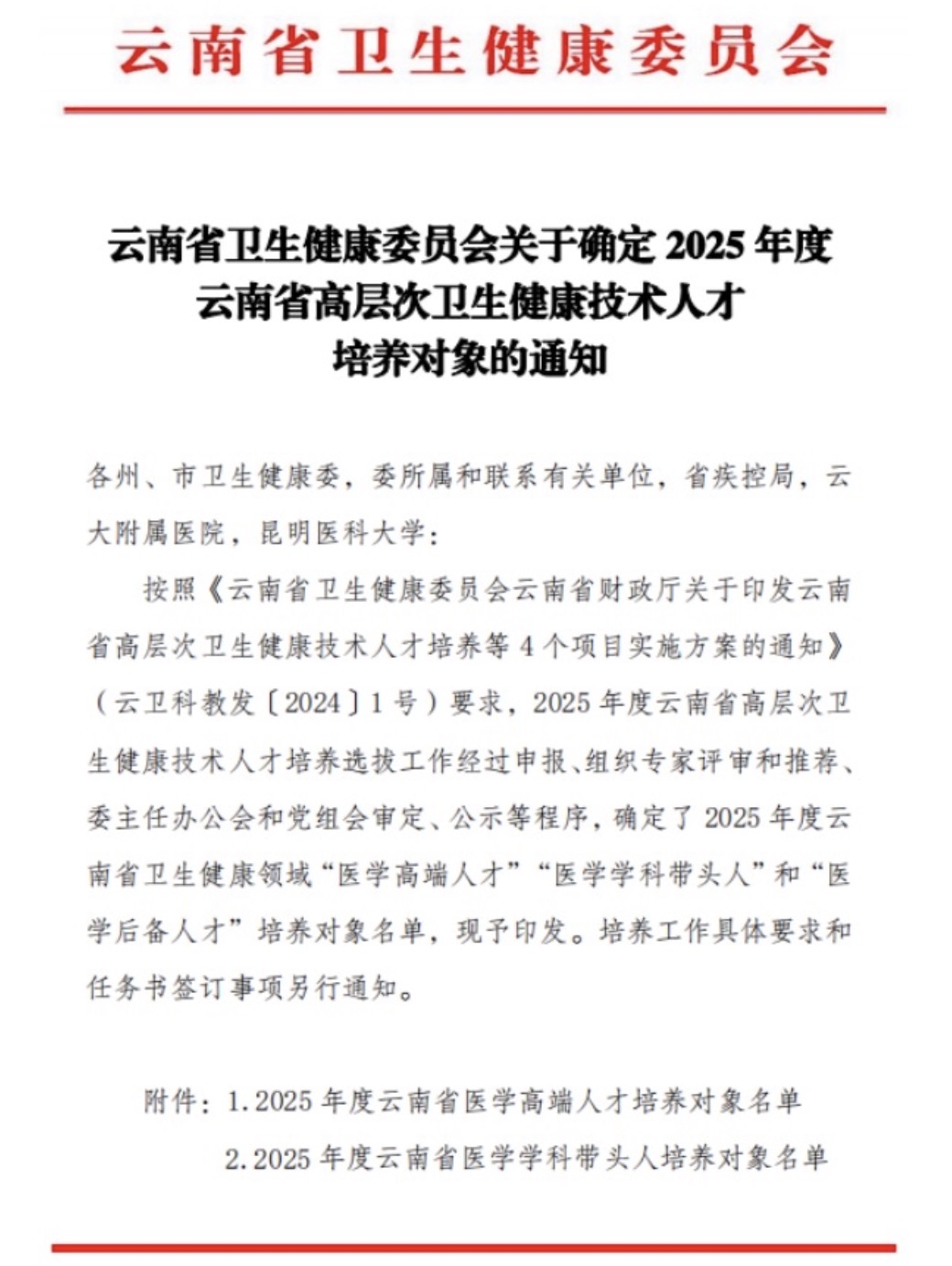 相关链接-云南省卫健委:关于2025年云南省高层次卫生健康技术人才培养对象名单的公示