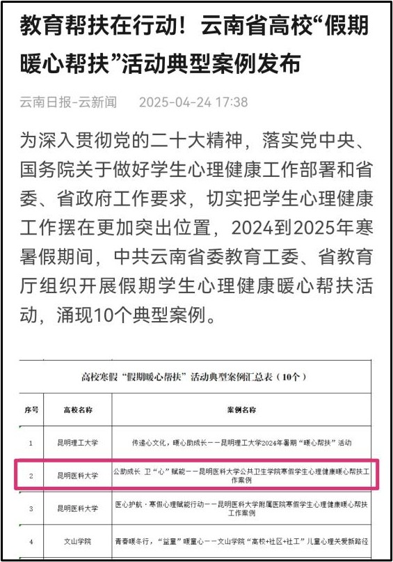 近日,云南省高校“假期暖心帮扶”活动典型案例发布,昆明医科大学公共卫生学院《公助成长 卫“心”赋能——昆明医科大学公共卫生学院寒假学生心理健康暖心帮扶工作案例》成功入选。