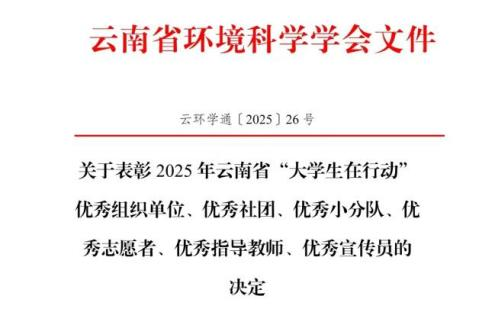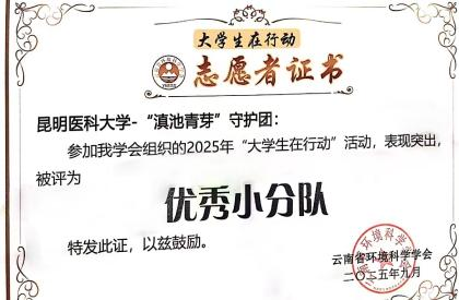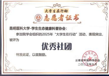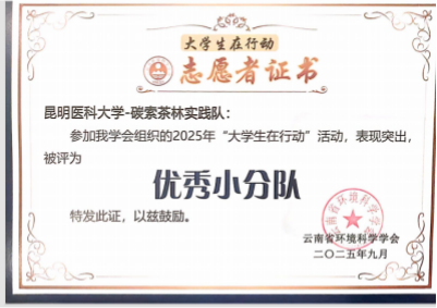 在集体荣誉方面,昆明医科大学凭借出色的组织协调工作获评“优秀组织单位”;学生生态健康科普协会因持续推动绿色理念传播与实践,被授予“优秀社团”称号;由我校学生组建的“碳索茶林实践队”与“‘滇池青芽’守护团”凭借创新的实践方案、扎实的行动推进和显著的实践成果,双双获评“优秀小分队”。
