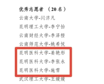 在个人奖项方面,公共卫生学院吴林雄老师荣获“优秀指导教师”称号。姜艳彤、李张永、施雪三位同学以高度的责任感和饱满的热情投身志愿服务,充分展现新时代昆医学子的担当精神,荣获“优秀志愿者”称号。
