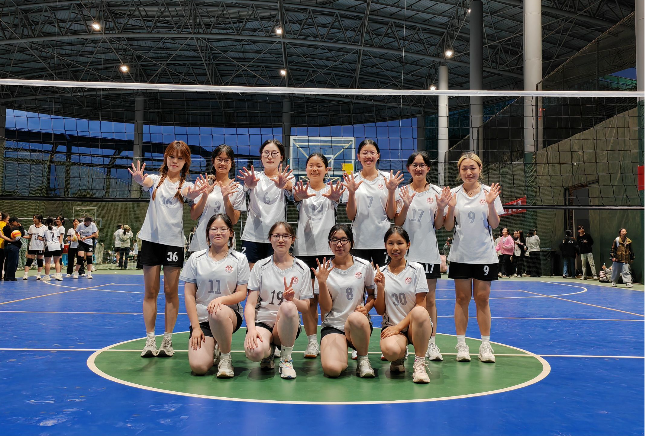 女排决赛中,队员们沉着应战,精准垫球、巧妙托传、强势扣杀,牢牢掌控比赛节奏。在关键局分紧咬的时刻,她们临危不乱,以一记精彩重扣锁定胜局,最终以3:0战胜康复学院,赢得季军。