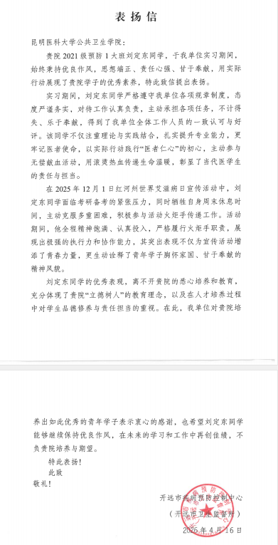 近日,昆明医科大学公共卫生学院收到开远市疾病预防控制中心(开远市卫生监督所)表扬信,对学院2021级预防医学专业本科生刘定东在实习期间的突出表现予以充分肯定。