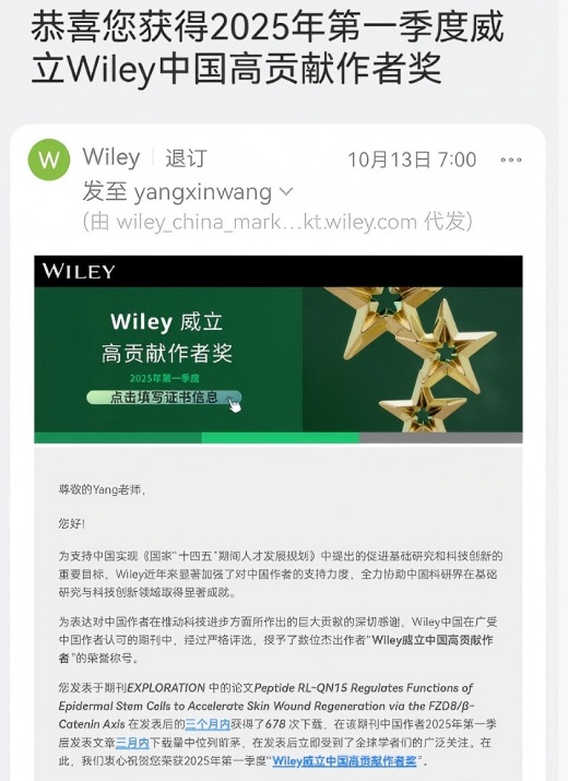 昆明医科大学基础医学院杨新旺教授团队在期刊《EXPLORATION》上发表的论文“Peptide RL‐QN15 Regulates Functions of Epidermal Stem Cells to Accelerate Skin Wound Regeneration via the FZD8/β‐Catenin Axis”,论文受到全球学者的广泛关注,下载量居于前列,因此荣获2025年第一季度“Wiley威立中国高贡献作者奖”。