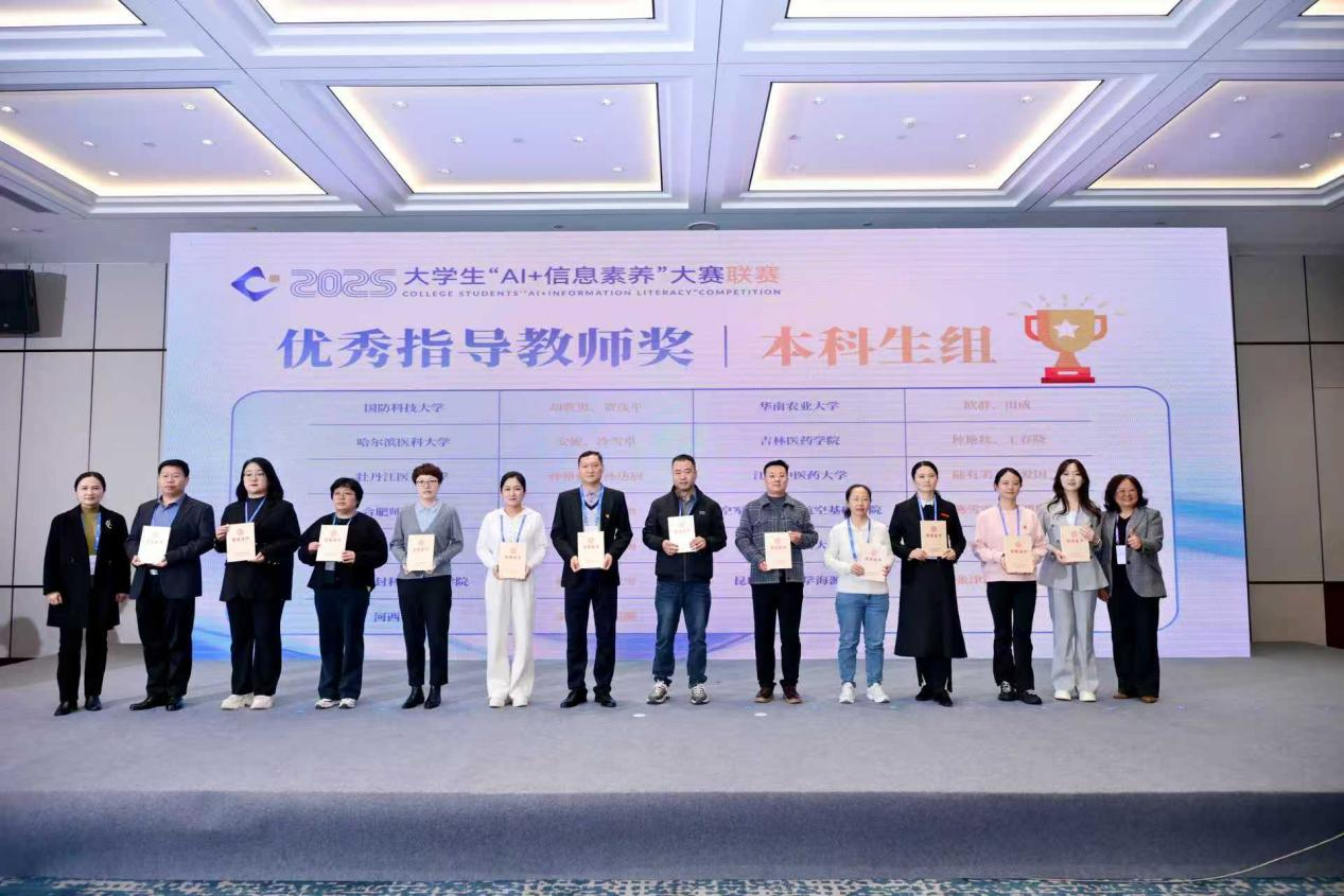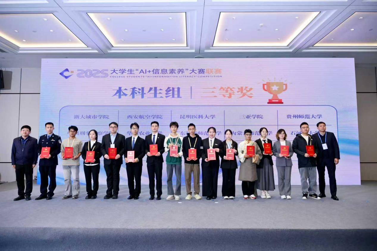11月27日,2025年大学生“AI+信息素养”大赛联赛暨高校信息素养教育教学研讨会在成都举办,来自31个省、自治区、直辖市和澳门特别行政区的大学生选手同台竞技。经过激烈角逐,由昆明医科大学基础医学院张容嘉、李宇清,药学院陈志礼等3名同学组成的“尽量做队”团队代表学校参赛,荣获本科生组三等奖。谭睿璟、王俊瑛2位教师获优秀指导教师奖。
