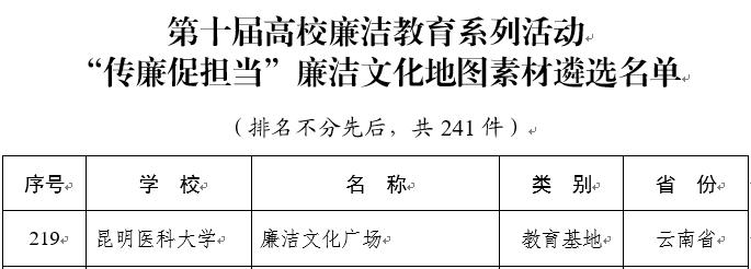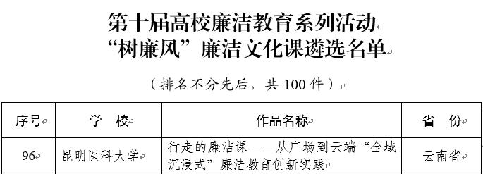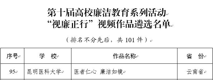 近日,教育部公布《第十届高校廉洁教育系列活动结果的通知》,昆明医科大学选送的3项作品入选。其中,“廉洁文化广场”教育基地入选“传廉促担当”廉洁文化地图素材名单,《行走的廉洁课——从广场到云端“全域沉浸式”廉洁教育创新实践》入选“树廉风”廉洁文化课名单,《医者仁心 廉洁如镜》入选“视廉正行”视频作品名单。此次活动云南省高校共有22件作品入选,学校是云南省取得最好成绩的高校之一,也是学校在该活动中所取得的最好成绩。