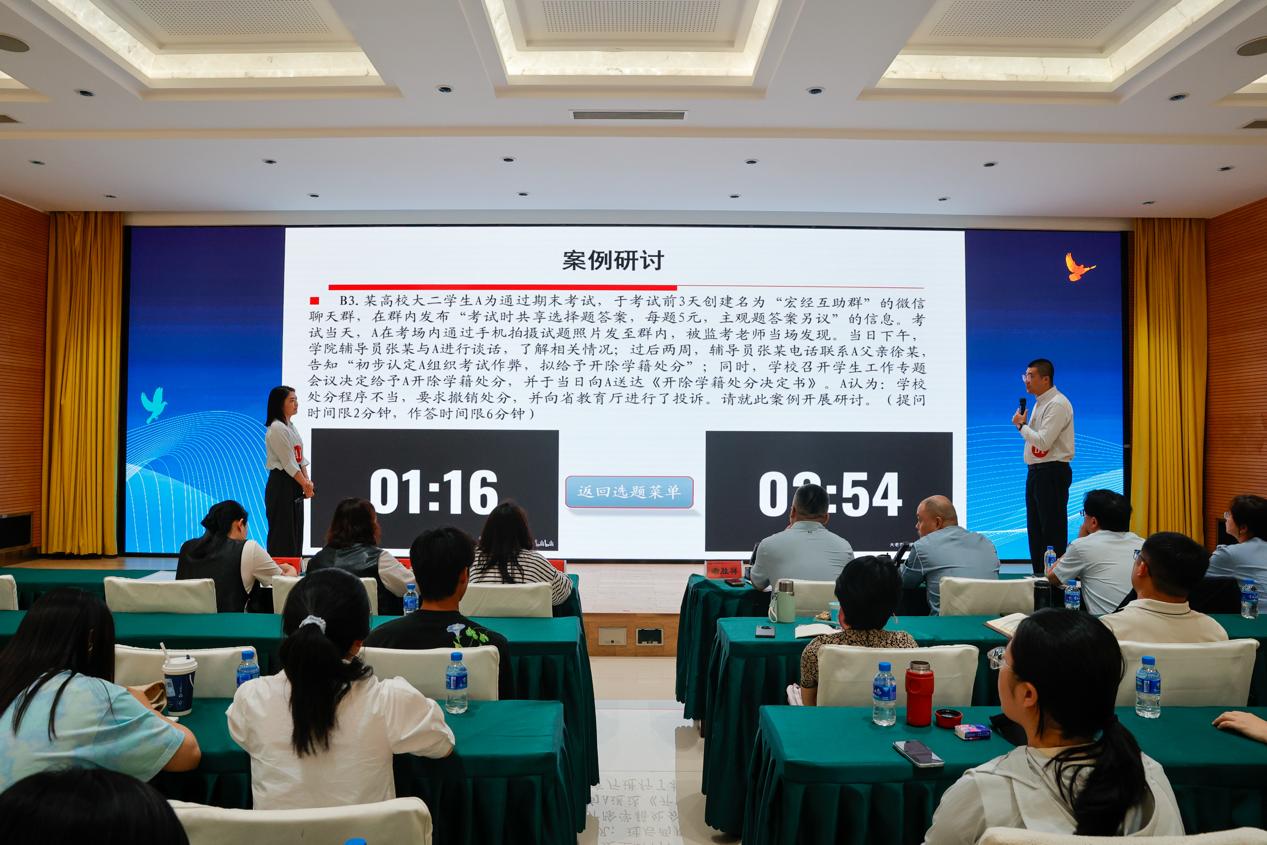 决赛阶段分为学情分析、案例研讨和谈心谈话3个环节,10位辅导员紧扣学生工作实际,将理论融入实践,通过研讨、剖析与谈话,再现了辅导员日常工作的点滴瞬间。