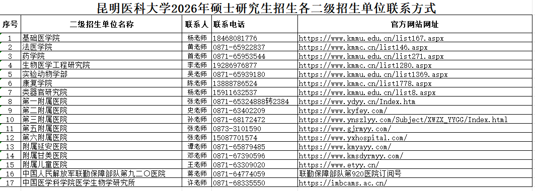学校根据《昆明医科大学2026年硕士研究生招生考试复试录取工作办法》开展调剂复试工作,复试采取差额复试。具体工作由各二级招生单位组织,各专业复试时间、地点由各二级招生单位在本单位官网公布或电话告知,请考生注意查看各二级招生单位官网发布的相关信息,保持通讯畅通,按二级单位要求参加现场审查及复试。