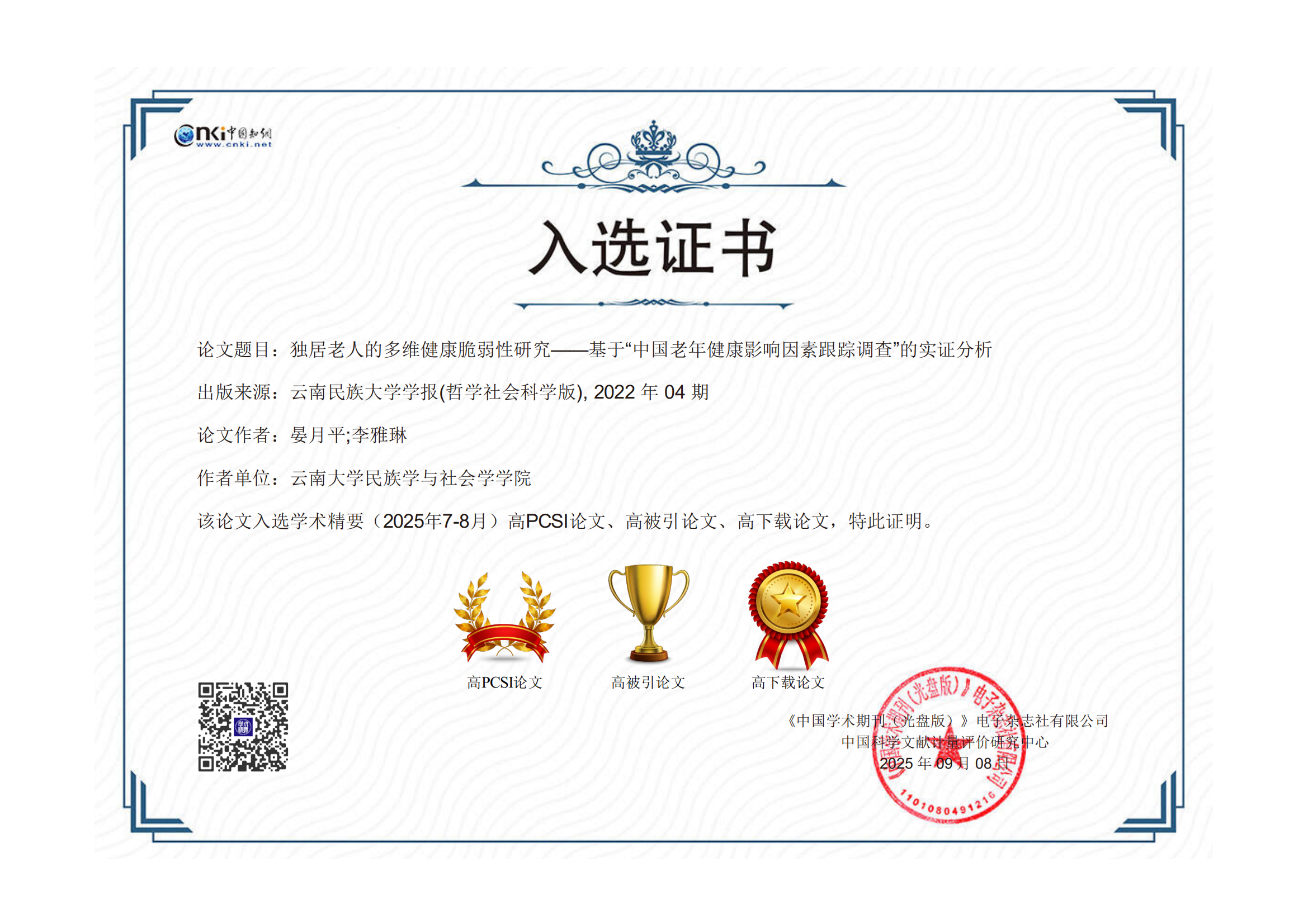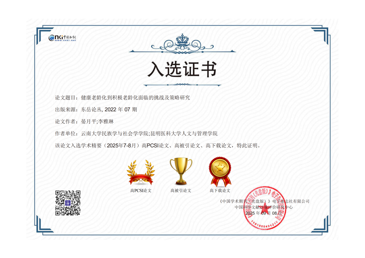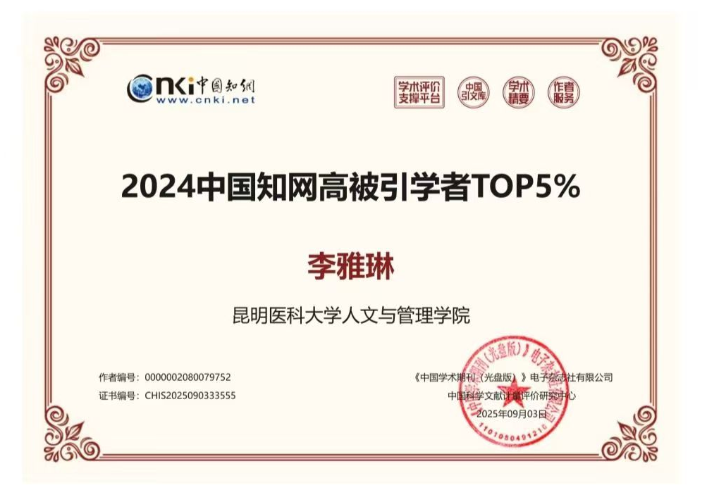 近日,中国知网下属的中国科学文献计量评价研究中心(简称“知网评价中心”)基于中国知网收录的近十年国内学术论文,2024年首次遴选了“中国知网高被引学者”名单,昆明医科大学人文与管理学院教师李雅琳入选“2024中国知网高被引学者TOP5%”名单。同期,李雅琳作为第二作者发表于期刊《东岳论丛》2022年07期的论文《健康老龄化到积极老龄化面临的挑战及策略研究》和发表于《云南民族大学学报》(哲学社会科学版)2022年04期的论文《独居老人的多维健康脆弱性研究——基于“中国老年健康影响因素跟踪调查”的实证分析》入选学术精要(2025年7—8月)高PCSI论文、高被引论文、高下载论文。